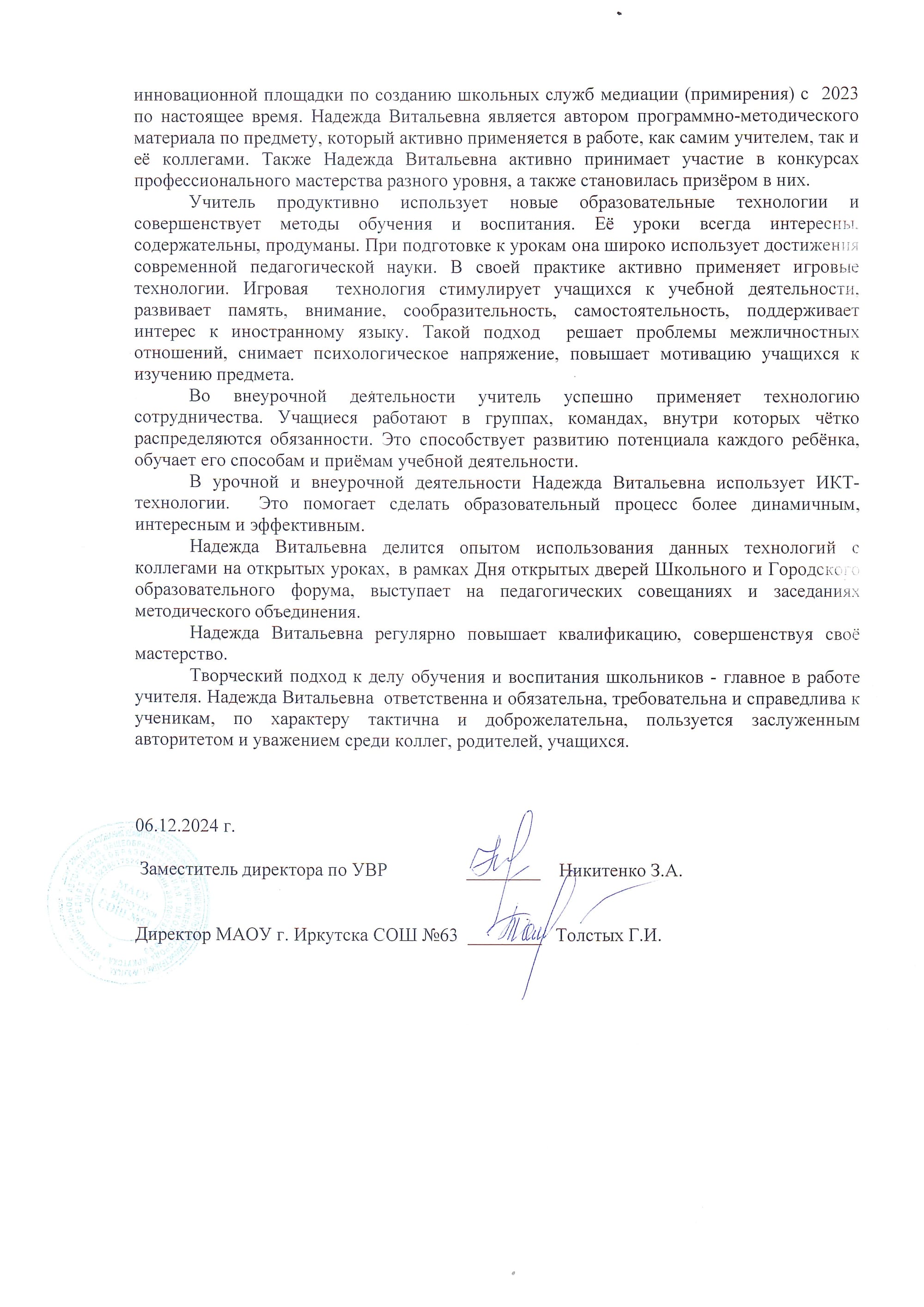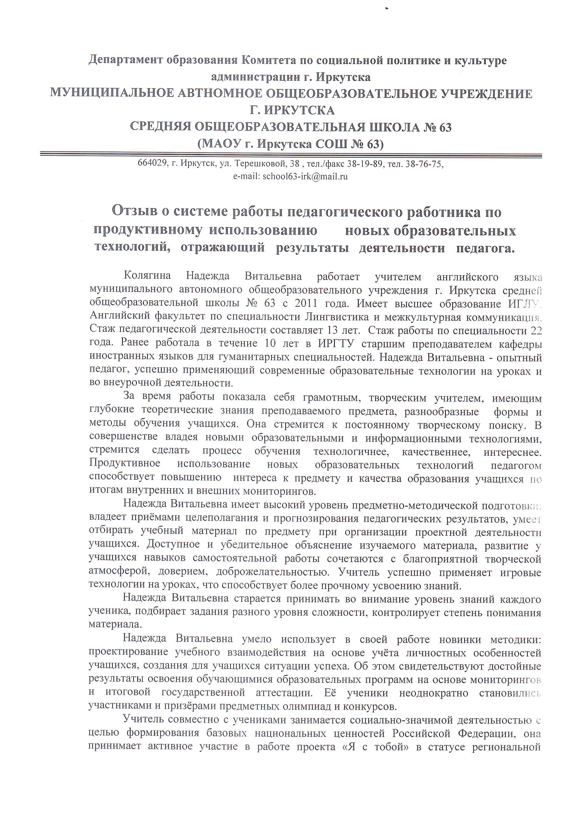 Отзыв о системе работы педагогического работника по продуктивному использованию новых образовательных технологий, отражающий результаты деятельности педагога Полезные ссылки • 5 дек. 2024 г. Теги Полезные ссылки Мои достижения Надежда Колягина Рекомендуем Полезные ссылки Элективный курс по английскому языку для учащихся 9х классов "Деловой английский" год назад • 1 минута на чтение